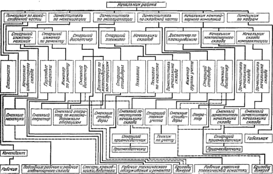Грузовой район является основным производственным подразделением порта, где производятся погрузочно-разгрузочные, вспомогательные операции на судах и смежных видах транспорта, обслуживание судов, прием, хранение и выдача грузов. За грузовым районом закреплена территория, служебные помещения, перегрузочные комплексы с причалами, складами, перегрузочным оборудованием, железнодорожными и автомобильными путями, а также вспомогательными устройствами, приспособлениями, обеспечивающими его нормальную работу. Грузовой район располагает постоянным контингентом портовых рабочих, инженерно-технических работников и служащих, обеспечивающих выполнение поставленных перед районом задач. Начальник района назначается начальником порта. Он наделен соответствующими правами и в своей деятельности руководствуется действующими положениями, инструкциями и законами, приказами начальника порта, распоряжениями и указаниями заместителя начальника порта по эксплуатации и производственно-финансовым планом. Руководство районом начальник осуществляет через своих заместителей (по эксплуатации, механизации и складской части), помощников (по кадрам и хозяйственной части), старших специалистов по соответствующим функциям . Заместитель начальника района по эксплуатации руководит организацией работ по загрузке-разгрузке судов и смежных видов транспорта (вагонов, автомашин), обслуживанию судов, а также технологической подготовкой производства района. Ему подчинены диспетчерская, технологическая и стивидорские группы и начальники специальных комплексов (контейнерного и др.). Диспетчерская группа планирует и организует перегрузочные работы, ведет учет и анализ обработки транспортных средств, возглавляет работу смен, комплектует бригады докеров-механизаторов, составляет графики их выхода на работу. Технологическая группа занимается вопросами технологической подготовки производства района. Функциональные обязанности и порядок работы диспетчерской и технологической групп более детально рассмотрены в главах и параграфах, посвященных диспетчерской системе руководства и технологической подготовке производства порта. Старший стивидор осуществляет подготовку, планирует (составляет план-график обработки судна) и руководит обработкой судна, представляет грузовой район во взаимоотношениях с судном и поддерживает связь с судовой администрацией, оформляет документы, связанные с обработкой судна. Сменный стивидор руководит обработкой судна на своей смене в соответствии с грузовым планом, сменно-суточным планом, планом-графиком обработки судна и технологическими картами. Заместитель начальника района по складской части осуществляет руководство работой складов по приему, хранению, выдаче, учету и оформлению грузов. В складскую часть района входят: начальники складов и их заместители, сменные заместители начальников складов, которые занимаются организацией перегрузочных работ на складах, приемкой, хранением и выдачей грузов. Оформление и учет грузов ведут заместители начальников складов по учету группы учета, старшие тальманы и тальманы, старшие приемосдатчики и приемосдатчики. Сменные стивидоры и сменные заместители начальников складов являются производителями грузовых работ, т. е. именно они непосредственно руководя! 