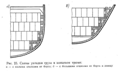Геометрические формы отдельных грузовых помещений судна неодинаковы: трюмы имеют более криволинейную бортовую обшивку, чем твиндеки, причем наибольшей криволинейностью отличаются концевые трюмы. При подборе груза по форме необходимо учитывать конфигурацию грузового помещения . Ящики, кипы и другие грузовые места прямоугольной формы лучше размещать в твиндеках и в средних трюмах, а мешки, тюки и бочки - в концевых трюмах. Если по грузовому плану размещаются грузы в различной упаковке, то для максимального использования вместимости к бортам следует укладывать грузы в мешках, бочках, барабанах, рулонах. Порядок загрузки грузовых помещений определяется способом выполнения работ. Если укладка производится поштучно, то загрузка трюма или твиндека ведется путем последовательного выкладывания грузов слоями высотой до 1,5 м. При использовании внутритрюмной механизации в под палубных пространствах штабель выкладывают на возможно большую высоту, а затем загружают площадь под просветом люка. При загрузке трюма большой высоты применяют смешанный способ: сначала груз укладывают с помощью машин на высоту, которую они могут обеспечить, а затем послойно вручную.