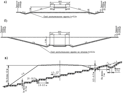 Рисунок 12 – Поперечные профили земляного полотна: а) в насыпи; б) в выемке); в) на косогоре