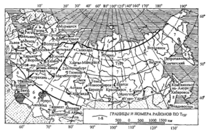 | 2 | Севернее линии, соединяющей Онегу – Архан-гельск – Мезень – Нарьян-Мар – шестидесятый меридиан, до побережья Европейской части | 145 |