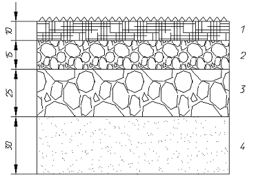 Конструктивные слои дорожной одежды должны быть представлены на листе графической части проекта с обозначениями и толщиной конструктивных слоев (рисунок 16).