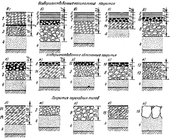 а – цементобетонное покрытие; б – асфальтобетонное покрытие на гравийном основании; в – трехслойное асфальтобетонное покрытие на бетонном основании (применяется в городах); г – асфальтобетонное покрытие на основании из щебня, обработанного в установке органическими вяжущими, и грунта, укрепленного битумом и цементобетоном; д – асфальтобетонное покрытие на гравийном основании; е – покрытие из щебня, обработанного органическими вяжущими, на щебеночном основании; ж – покрытие из щебня, обработанного органическими вяжущими на основании из цементо-грунта; з – покрытие из щебня, обработанного органическим вяжущим, на щебеночном основании; и – покрытие из гравийной смеси, обработанной органически-ми вяжущими, на гравийном основании; к – покрытие из щебня, укрепленного 6 % цемента, на основании из щебня, укрепленного 4 % цемента; л – покрытие из грунта, обработанного неорганическими вяжущими материалами; м – щебеночное покрытие; н – гравийное покрытие; о – покрытие из гравия, обработанного малыми дозами вяжу-щих материалов; п – булыжная мостовая; р – покрытие из оптимальной грунтовой смеси; с – покрытие из грунта, укрепленного добавками щебня, гравия, шлаков;