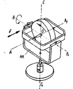 Гироскоп начнет поворачиваться не вокруг оси СС1 а вокруг оси ВВ1. в направлении, указанном стрелкой. Скорость вращения гироскопа вокруг оси ВВ1 будет тем больше, чем больше сила F.