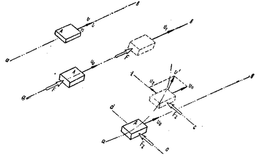 Если на тело А, движущееся по прямой ab со скоростью у0 (рис.10), подействовать в направлении его движения силой F, то по истечении весьма малого промежутка времени оно будет продолжать двигаться в прежнем направлении ab, но уже с новой скоростью vt.