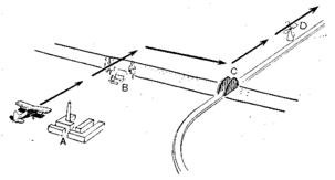 Так, например, если самолет должен был совершить перелет по маршруту, включающему в себя пункты А, В, С и D (рис.13), то летчик вначале выбирал направление на поселок А, затем на хутор В, после чего вел самолет вдоль реки до моста С, через нее, и дальше выдерживал направление полета вдоль железнодорожного полотна вплоть до достижения пункта D. Благодаря хорошей видимости летчики легко ориентировались по лежащей под ними местности, а, используя линию естественного горизонта, могли выдерживать полет в горизонтальной плоскости.