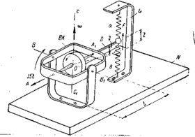 Если основание N поворачивать вокруг оси СС, с угловой скоростью ω, то вместе с основанием с такой же угловой скоростью а начнет поворачиваться и гироскоп. При этом последний будет поставлен в условия одновременного движения сразу вокруг двух осей: АА1 и CC1 с угловыми скоростями Ω и ω. В этом случае гироскоп начнет вращаться вокруг оси ВВ1 стремясь совместить свою главную ось АА1 с осью CC1 вынужденного поворота.