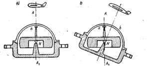 Волчок прибора приводился во вращение сжатым воздухом, подаваемым внутрь прибора через патрубок с и отсасываемым оттуда через трубку d. Волчок описываемого прибора упирался одним концом своей оси, так называемой шпилькой, в подпятник или топку N (рис.16).