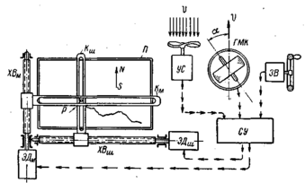 В счетно-решающем устройстве, куда непрерывно подаются значения величин воздушной скорости u самолета и курсового угла а, происходит разделение скорости v на составляющие uм и uш