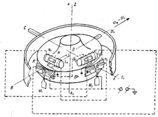 С обоих концов цилиндров располагаются катушки соленоидов N1, L1 и N2; L2, включаемые в сеть электрического тока посредством маятникового М, и М2, оси подвесов которых параллельны осям ВВ1 и CC1 гирокамеры. Предположим, что отклонение главной оси ЛЛ) гироскопа от направления истинной вертикали OZ произошло в результате поворота гироскопа вокруг оси CC1 в направлении, показанном стрелкой. При этом маятник М2, сохраняя отвесное положение, замкнет ламель K2, расположенную совместно со второй ламелью К1 на изолированном основании, укрепленном на корпусе гирокамеры.