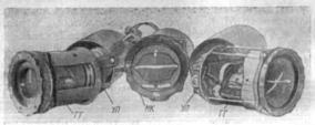 Для большей наглядности приведена фотография одновременно трех экземпляров одного и того же гироскопического комбинированного прибора. Каждый экземпляр с предварительно снятой защитной крышкой установлен под различным углом зрения к объективу, благодаря чему читатель может составить представление и о компановке прибора, и о его наружном виде со стороны шкалы.