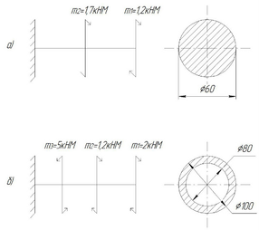 Проверить прочность и жесткость стальных брусьев, если [τк]=40МПа; [φ0]=0,6