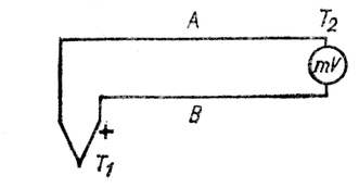 Если температуры «спаев» одинаковы, то сумма разности потенциалов в замкнутой цепи равна нулю. Иначе обстоит дело, когда один из спаев имеет температуру T1, а другой — температуру Т2 (рис. 2–2).