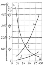 Рис. 3-1. Зависимость полного сечения сталеалюминиевого провода марки АС (кривая 1), сечения стального сердечника (кривая 2) и активного электрического сопротивления (при частоте 50 Гц) единицы длины провода (кривая 3) от внешнего диаметра провода D