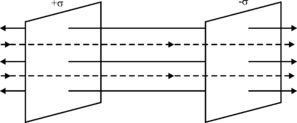 Б) Напруженість поля 2-х паралельних різнойменно заряджених нескінчених пластин з однаковою поверхневою густиною зарядів (принцип суперпозиції):
