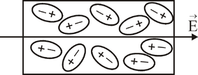 Якщо діелектрик з полярними молекулами не знаходиться в електричному полі, то внаслідок хаотичного теплового руху дипольні моменти окремих молекул орієнтуються в просторі безладно. Тому, векторна сума дипольних моментів всіх молекул дорівнює нулю, і діелектрик в цілому не має дипольного моменту. При внесенні такого діелектрика в електричне поле жорсткі диполі намагаються повернутись так, що вектори їх дипольних моментів співпали по напрямку з вектором Е. Але тепловий рух перешкоджає строгій орієнтації моментів диполів. Тому, моменти приймають тільки переважну орієнтацію по напрямку зовнішнього поля (рис. 6). Ця орієнтація буде тим більшою, чим сильніше зовнішнє поле і чим нижча температура діелектрика. Такий вид поляризації називають дипольною або орієнтаційною поляризацією.