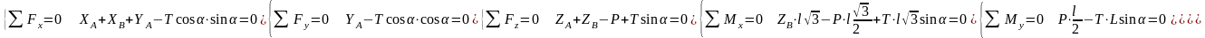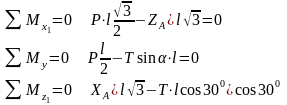 Для полученной в расчетной схеме плоской системы сходящихся сил составляем три уравнения равновесия в проекциях на оси координат x, y и z и сумму моментов сил относительно координатных осей x, y и z. (