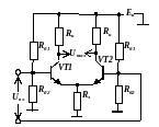 Данная схема по существу представляет собой мост, плечами которого являются коллекторные резисторы Rк и внутренние сопротивления транзисторов VTI и VT2. Резисторы Rб1 и Rб2 входят в делители напряжения источника витания и служат для выбора исходного режима работы транзисторов. В объединенную эмиттерную цепь включен резистор Rэ. К одной из диагоналей поста подведена напряжение источника питания Ек, а с другой – снимаются выходное напряжение (нагрузку каскада подключают между коллекторами транзисторов):