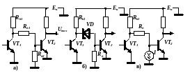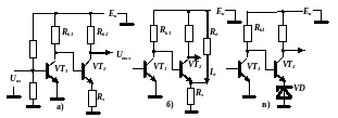 В схемах рисунка 6.1 использован первый подход: в цепь эмиттера введены дополнительные элементы – резистор или стабилитрон. Кроме повышения напряжения эмиттера это приводит к образованию отрицательной обратной связи, которая уменьшает коэффициент усиления схемы. Например, в первых двух схемах коэффициент усиления второго каскада