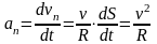 Найдем величину an. Проще всего это сделать, взяв наиболее простой случай криволинейного движения — равномерное движение по окружности. При этом at=0. Рассмотрим перемещение точки за время dt по дуге dS окружности радиуса R.