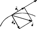 Выберем произвольную точку на траектории. Как всякий вектор, вектор ускорения можно представить в виде суммы его составляющих по двум взаимно перпендикулярным осям. В качестве одной из осей возьмем направление касательной в рассматриваемой точке траектории, тогда другой осью окажется направление нормали к кривой в этой же точке. Составляющая ускорения, направленная по касательной к траектории, носит название тангенциального ускорения at, а направленная ей перпендикулярно — нормального ускорения an.