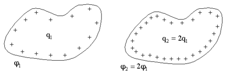 | Заряд q1 создаёт на уединённом проводнике потенциал φ1. | Заряд q2= 2q1 создаёт на том же проводнике потенциал φ2= 2φ1. |