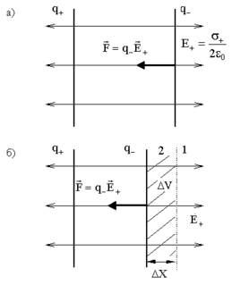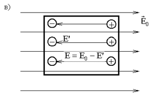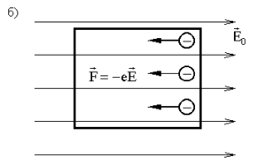 | Через очень малое время часть электронов сместится к левой грани параллелепипеда, на правой - положительные ионы. Перераспределившиеся заряды создают поле E', направленное навстречу E0. Когда величина E' сравняется с Е0, тогда результирующее поле в проводнике E = E0 - E' = 0, перераспределение электронов закончится. |