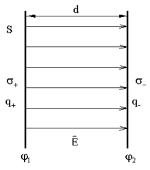 Плоский конденсатор - это две плоские пластины расположенные на небольшом расстоянии друг от друга.
