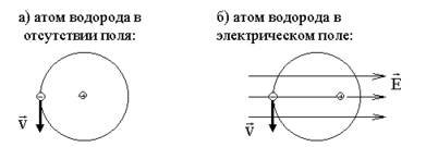 Неполярные диэлектрики - центры распределения "+" и "-" зарядов совпадают, молекула (атом) симметричны. Например, атом водорода. У него в отсутствии поля центр распределения отрицательного заряда совпадает с положением положительного заряда. При включении поля положительный заряд смещается в направлении поля, отрицательный - против поля: