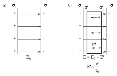 На следующих рисунках изображен плоский конденсатор без диэлектрика (рис. а) и с диэлектриком (рис. б). В конденсаторе без диэлектрика поле E0 создается свободными зарядами, т. е. зарядами, находящимися на пластинах конденсатора. В конденсаторе с диэлектриком поле E в объеме, занятом диэлектриком, является разностью двух полей: поля свободных зарядов (E0) и поля связанных зарядов (E'):
