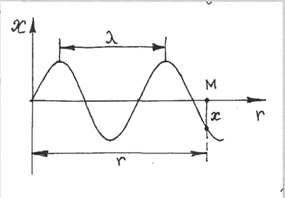 Будемо вважати, що хвильовий процес поширюється в напрямку вісі or.Знайдемо фазу коливань в довільній точці M, що розташована на відстані r від т.O(див. мал. 3). В даний момент часу t в т.M фаза коливань така ж, якою вона була в т. O