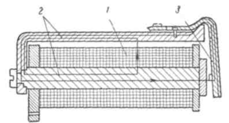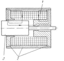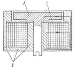 катушка с расположенной на ней намагничивающей обмоткой 1; неподвижная часть магнитопровода из ферромагнитного материала 2; подвижная часть магнитопровода — якорь 3.