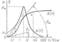 Важнейшей характеристикой ферромагнитного материала является связь между индукцией В (Тл) и напряженностью магнитного поля Н(А/м)(рис.1.4.):