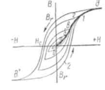 а — семейство симметричных петель гистерезиса: 1 — основная кривая намагничивания; 2 — предельная петля гистерезиса; б — основная кривая намагничивания и кривая относительной магнитной проницаемости