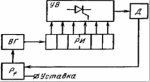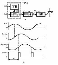 На рис.4.1, а приведена структурная схема одного канала одноканальной системы управления, использующей горизонтальный метод управления. Принцип работы схемы заключается в следующем. Генератор переменного напряжения ГПН вырабатывает синусоидальное напряжение, находящееся в определенном фазовом соотношении с анодным напряжением вентиля данного канала (рис.4.1, б). Обычно при m23 в качестве переменного напряжения берут напряжение соответствующей фазы сети (для трехфазной мостовой схемы сдвинутое на 90° относительно анодного напряжения вентиля). С выхода мостового фазовращательного устройства МФУ сдвинутое по фазе напряжение поступает на формирователь импульсов ФИ, где в момент перехода синусоиды через нуль формируется управляющий импульс, который затем усиливается усилителем мощности ВК. Угол сдвига фаз регулируется изменением напряжения управления Uу. ГПН и МФУ образуют фазосдвигающее устройство ФСУ.