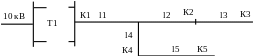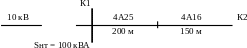Лінія напругою 0,38 кВ відходить від шин споживчої трансформаторної підстанції 10/0,4 кВ. Розрахункові данні наведені на схемі мережі (Рис. 6.1). Визначити струми триполюсного та однополюсного КЗ в точках К1 та К2.