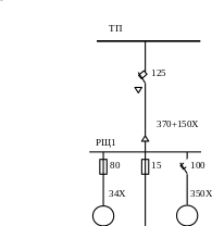В приміщенні встановлені електродвигуни із КЗ ротором та освітлювальні установки. Двигун М1 працює без перевантаження, М2 – з перевантаженням. Лінія ТП-РЩІ (Рис. 7.2) прокладена кабелем в землі при