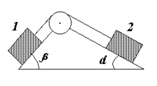 123. Невесомый блок укреплен в вершине двух наклонных плоскостей, составляющих с горизонтом углы =30 и =45. Гири 1 и 2 одинаковой массы m1=m2=1 кг соединены нитью и перекинуты через блок. Найти ускорение а, с которым движутся гири, и силу натяжения нити Т. Трением гирь 1 и 2 о наклонные плоскости, а также трением в блоке пренебречь.