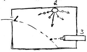 Джерело світла (2) може випускати фотони будь-якої необхідної енергії (тобто частоти або довжини хвилі). Єдиний електрон можна спостерігати в ідеальний мікроскоп. Спочатку електрон буде рухатись по параболічній траєкторії під дією гравітаційного поля Землі. Але, коли він зіткнеться з фотоном, що має певну масу, то він відскочить і його швидкість зміниться. Тому, ведучи спостереження через послідовно малі проміжки часу можна помітити, що електрон рухається зигзагоподібно під впливом послідовних зіткнень з фотоном.
