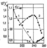 Рисунок 12. Температурная зависимость обратной величины действительной (кривая 1) и мнимой (кривая 2) частей магнитной восприимчивости МЖ на основе керосина в интервале температур 170К<Т<273К