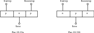 Транзистор (біполярний транзистор) – це напівпровідниковий пристрій, який призначений для підсилення електричного сигналу (струму, напруги), та має два р-шари і один n-шар (рис.10.13а), або один р-шар і два n-шари (рис.10.13б), з 2-ма електронно-дірковими переходами (р-n-переходами) і 3-ма виводами. Шари, що знаходяться по краях транзистора, називають колектором і емітером, а середній шар називають базою.