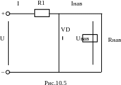 Стабілітрон призначений для стабілізації напруги, тобто підтримки напруги на одному рівні. Стабілітрон включають паралельно навантаженню (рис.10.5). При збільшенні вхідної напруги зростає струм у колі R1 – VD, а напруга на навантаженні Uнав (яка дорівнює напрузі стабілізації) практично не змінюється за рахунок спадання надлишкової напруги на резисторі R1.