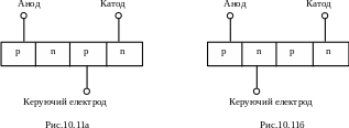 Тиристор – це напівпровідниковий керований пристрій, який має два р-шара і два n-шари, із трьома електронно-дірковими переходами (р-n-переходами) і трьома виводами. Вивід з р-шару називають анодом, вивід з n-шару називають катодом, третій вивід називають керуючим електродом, який може приєднуватися як до р-шару, так і до n-шару (рис.10.11а, 10.11б).