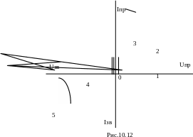 Вольт-амперна характеристика тиристора має вигляд, показаний на рис.10.12. Якщо керуючий електрод не підключений до мережі, то один з р-n-переходів закритий і тиристор працює на 1-й ділянці ВАХ.