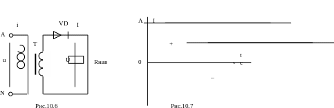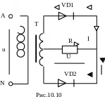 Розглянемо однопівперіодну схему випрямлення (рис.10.6). Вона складається з трансформатора, до вторинної обмотки якого послідовно підключаються діод і споживач електроенергії. Випрямлення струму за цією схемою здійснюється в такий спосіб: у першу половину періоду (у 1-й півперіод) електричний струм проходить через діод, у другу половину періоду (у 2-й півперіод) електричний струм фактично не проходить через діод, далі процес повторюється. Отже, протягом 1-го півперіоду напруга на навантаженні є, а протягом 2-го півперіоду вона відсутня. Струм, який протікає в колі навантаження, є пульсуючим, тобто змінюється його сила, але не змінюється його напрям (рис.10.7).