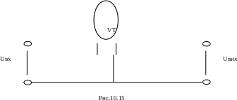 Отже, якщо струм у базі, буде вхідним сигналом, а струм у колекторі – вихідним сигналом, то транзистор буде працювати в режимі підсилення вхідного електричного сигналу. У цьому випадку загальною точкою вхідного і вихідного електричного кола є емітер, а схему називають «із загальним емітером» (рис.10.14). Схему «із загальною базою» використовують для підсилення напруги (рис.10.15).