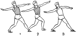 левая нога ставится в положение шага для метания с места так, чтобы вызвать вслед за собой продвижение колена правой ноги, не поворачивая тела в направлении броска. Выполняется без броска - 2 серии по 6 – 7 раз.