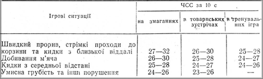 Дослідження динаміки ЧСС у спортсменів вищої кваліфікації показали, що в ігрових ситуаціях, які передують виконанню штрафних кидків, ЧСС досягає 26—32 і більше ударів за 10 с. і становить найбільший показник пульсу у даній грі (табл. 1).
