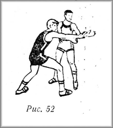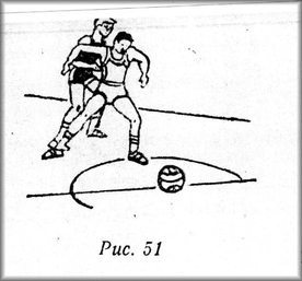 3. М'яч лежить у центрі кола. За сигналом нападаючий намагається увійти в коло, щоб оволодіти м'ячем (рис. 51). Захисник, зробивши блокуючи оберт, не дає нападаючому увійти в круг, втримуючи його «на спині», рахуючи при цьому час протидії: «раз, два, три». Через 2—3 спроби гравці міняються ролями.
