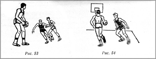 3. Нападаючий і захисник — біля бічної лінії. Нападаючий починає ведення у напрямку лінії штрафного кидка, захисник супроводжує його, не виявляючи активності. При вході у 3-секундну зону, нападаючий завершує ведення і переходить на кидок однією рукою в русі з обертом перед кільцем. Захисник у стрибку протидіє кидку, намагаючись накрити м'яч (рис. 54).
