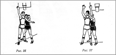 Захисник у такій позиції центрового повинен бути попереду зі сторони м'яча та заважати йому ловити м'яч (рис. 56). Коли центровий одержує м'яч, захисник мусить вмить відступити дещо назад. При спробі блокувати кидок центрового захисник стоїть на підлозі до того моменту, поки суперник не відірветься від підлоги. Якщо захисник вистрибне скоріше центрового або втратить рівновагу, тоді суперник може легко звільнитися від його опіки, тому що в такому разі буде вже тяжко вибити або блокувати м'яч при кидку. В такій ситуації доцільно продумати і вдосконалювати взаємодії захисників, які підстраховують один одного.